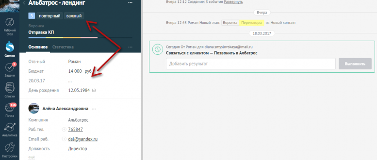 Вводите для сделок свои теги и дополнительные параметры, создавайте примечания, добавляйте списки, дни рождения и т.д. Все это пригодится, чтобы фильтровать продажи (по источникам лидов или типу взаимодействия), готовить для клиентов индивидуальные предложения, помнить об их нуждах и предпочтениях.