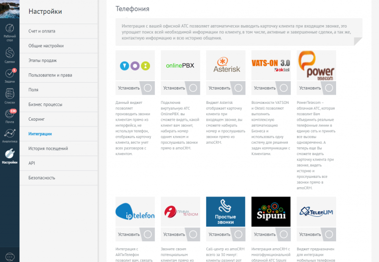 Доступно около 60 провайдеров виртуальной облачной АТС: выбирайте любого и звоните клиентам прямо из CRM. Можно подключить удаленных call-менеджеров.