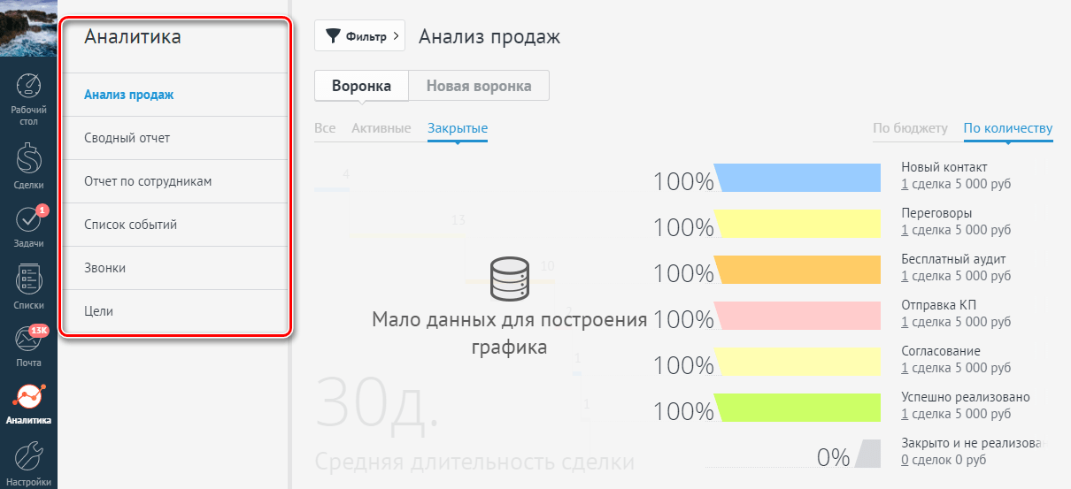 Доступно только 4 отчета: по продажам, сотрудникам, целям и звонкам. Все они объединены в сводный отчет. Разрабатывать и добавлять отчеты самостоятельно нельзя. Это не критично, но для работы с продажами желательна более развитая система аналитики.
