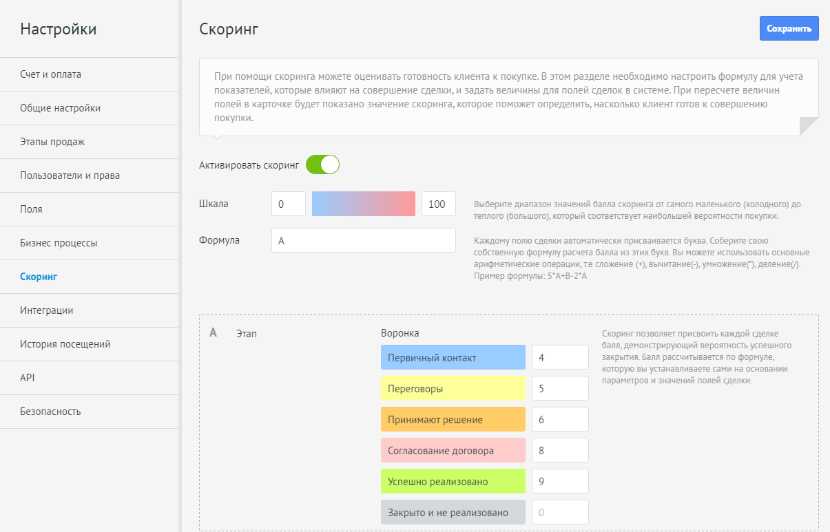 По умолчанию нам показывают результаты всего отдела продаж, но можно посмотреть отчет по конкретному менеджеру. Или по группе менеджеров. Мобильная версия выглядит так Разобраться в amoCRM легко: настройки простые, а все пункты взаимосвязаны. Хватит пары часов, чтобы настроить все параметры и запомнить, что где находится. Система хорошо визуализирована: на рабочем столе и в разделе аналитики много графиков и ярких диаграмм. Настроить воронку продаж тоже несложно. AmoCRM предлагает 4 стандартных этапа – от первичного контакта до согласования договора. Можно оставить их как есть, а можно дополнить или полностью изменить. Все это делается в одном окне. Есть и более сложные инструменты. Например, скоринг поможет вам прогнозировать, какова вероятность целевого действия (закрытия на продажу, повторной продажи и т.д.). Здесь нужно заморочиться: рассчитать «вес» каждого показателя и создать формулу расчета. Или проигнорировать эту возможность. Все равно она доступна только в максимальном тарифе.