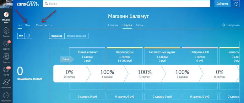 Интерфейс очень простой. В боковом вертикальном меню 7 пунктов: рабочий стол, сделки, задачи, списки клиентов, почта, аналитика и настройки. Этими разделами вы будете пользоваться ежедневно. Ничего лишнего нет. AmoCRM начинается с рабочего стола – здесь собрана вся информация о продажах. Видно, на каких стадиях находятся сделки и какова конверсия при переходе на следующие стадии. Можно сразу оценить положение дел и открыть важную сделку.