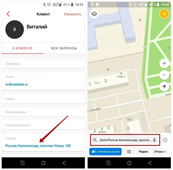 Если в карточке клиента кликнуть на его адрес, он откроется на карте, которая установлена на смартфоне пользователя — Яндекс.Карты, 2Гис, Google.Карты или другой. Если в смартфоне нет картографического приложения, откроется страница установки Яндекс.Карт на Google Play Store. Пользователь сможет сразу установить приложение и в дальнейшем быстро ориентироваться, где именно находится клиент. Это особенно удобно для курьеров: не нужно заходить в приложение и вбивать адрес вручную, достаточно просто кликнуть на него в карточке клиента.