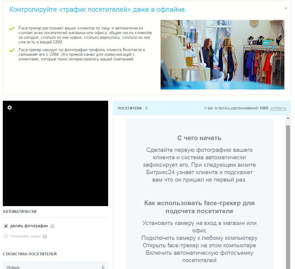 Если у вас есть заведение вроде магазина или кафе, в котором стоят камеры – Face-tracker от Битрикс будет фотографировать посетителей и «узнавать» их при повторном визите. А вы узнаете, какой сегодня был трафик и сколько пришло постоянных клиентов.