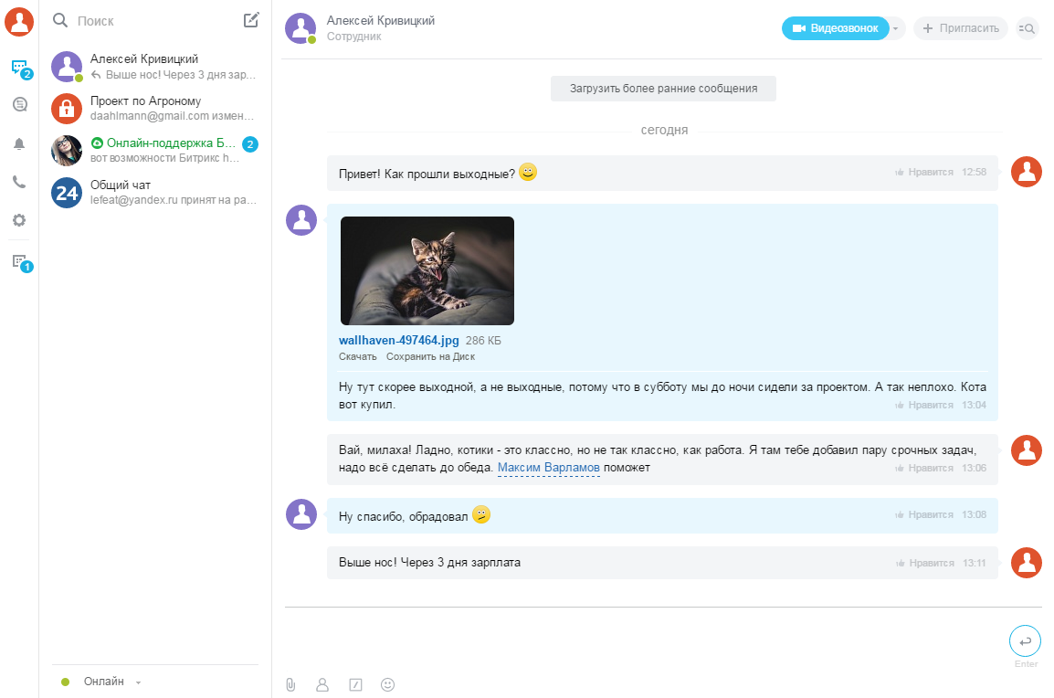 Тут сотрудники и руководители переписываются, ставят лайки, создают опросы, прикрепляют файлы и отмечают людей – почти как в ВК или на Фейсбуке. К обсуждениям можно привлекать даже клиентов. Соцсеть Битрикс приучает сотрудников обсуждать задачи прямо в CRM, без скайпа и мессенджеров. Работа полностью переносится в Битрикс – это экономит время и помогает не отвлекаться.
