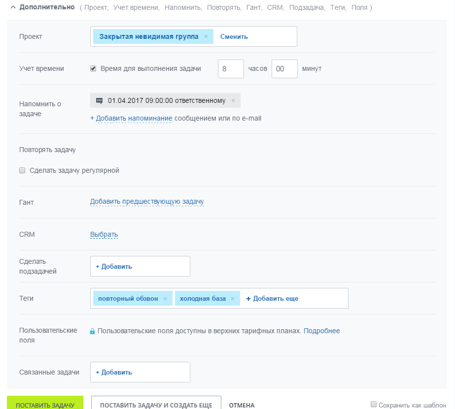 Еще можно прикрепить задачу к проекту, пометить ее тегами, выставить счетчик времени и настроить автоматические уведомления исполнителю. Каждую задачу легко связать с другой или присоединить к более масштабной в качестве подзадачи.