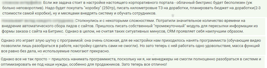 И так во всем. Битрикс24 хороша как комплексный портал-интернет. В этом ее прелесть. Но если рассматривать ее только как CRM в отрыве от остального – это просто крепкий середнячок. Ее надо пробовать в деле, иначе вы не поймете, насколько она подходит для ваших нужд. С равной вероятностью Битрикс может оказаться как идеалом, так и неудобной в работе громадиной.