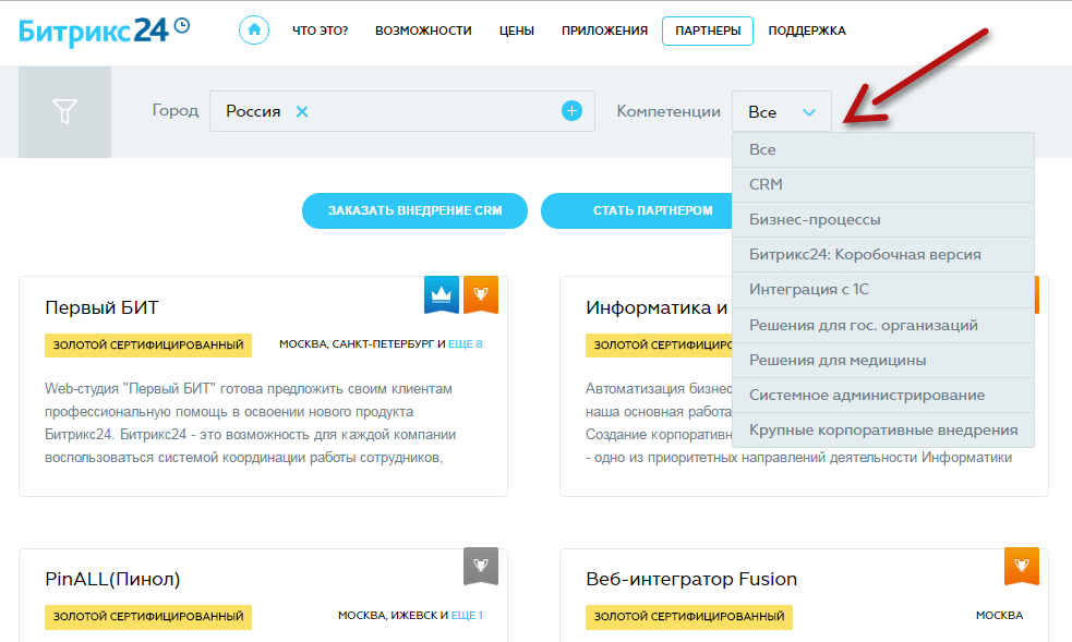 Партнеров можно отфильтровать по компетенциям: одни занимаются только CRM, другие внедряют Битрикс в госучреждения и медклиники