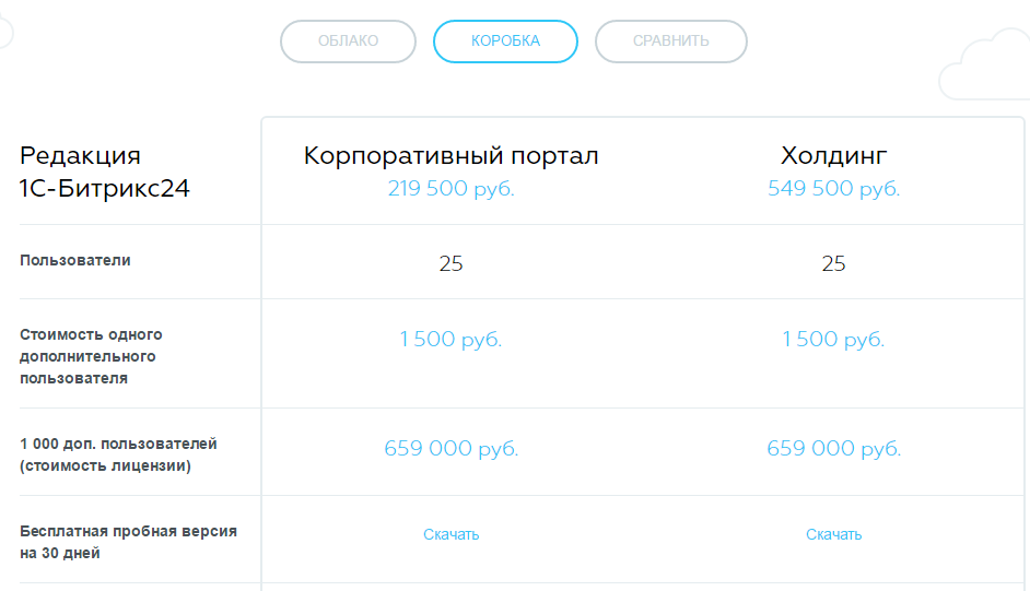 Максимальный тариф «Компания» можно попробовать бесплатно – тестовый период составляет 30 дней. Локальная версия рассчитана на крупные компании. Ее мы оплачиваем единоразово, но нужно будет докупать продление обновлений.