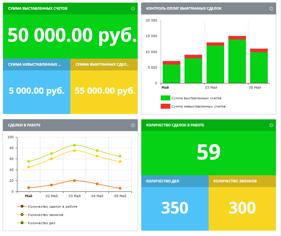 Выбираем CRM – и на стартовой странице будем видеть отчеты по продажам