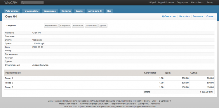 Данную CRM систему мы рекомендуем для строительных фирм, которым необходимо работать в условиях мультивалютности – осуществлять продажи на международном рынке, либо импортировать товар. Как и другие аналогичные системы WireCRM умеет автоматически генерировать счета и даже самостоятельно оправлять их клиенту, отслеживать их статус и оповещать о просрочках. Закрывающие документы (акты) также можно формировать внутри WireCRM. Можно смело сказать, что система берет на себя часть работы бухгалтера. Финансы можно разделять не только на «приход» и «расход», по группировать по счетам и категориям, а также автоматически подсчитывать баланс.