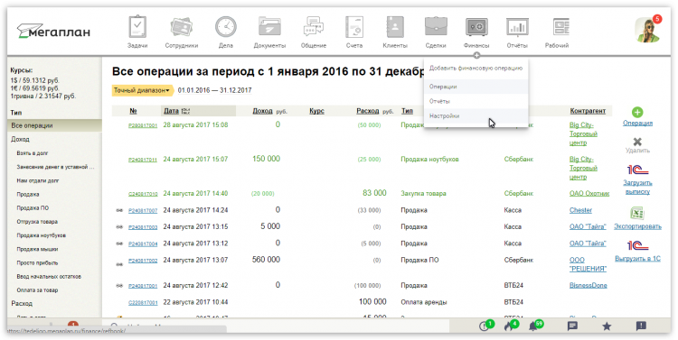 Это одна из наиболее известных CRM систем российского производства, которая существует с 2008 года. Изначально функционал учета финансов в ней отсутствовал, но со временем проектировщики добавили его. Плюс системы заключается в ее комбинировании CRM и BPM, а также в возможности ведения проектов. В Мегаплане можно контролировать доходы и расходы по каждому отдельному клиенту и по отделу в целом. Возможно непосредственно из системы автоматически выставлять счета, для этого в карточке клиента просто необходимо указать его реквизиты. Это значительно экономит время и ускоряет поступление средств. На основе финансовых данных по клиентам и сделкам с ними формируются отчеты, которые позволяют оценить эффективность бизнеса – в частности подсчитать расходы по сделкам, уже полученные предоплаты и количество дебиторской задолженности.