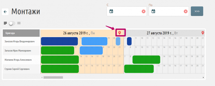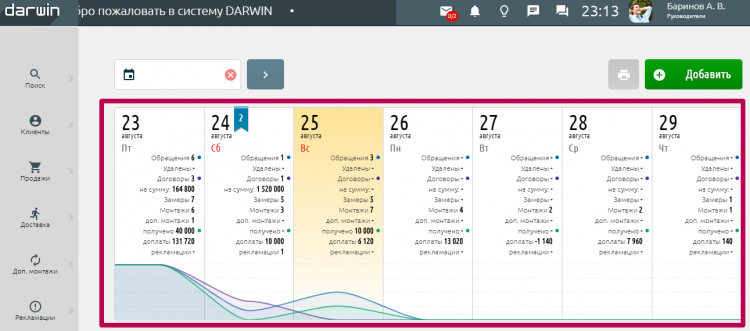 Включает в себя информацию о продажах (заявках). Сводные данные об оказанных услугах выводятся в календарном виджете. В нем видно, какая бригада и по какому адресу проводила монтаж или замер.