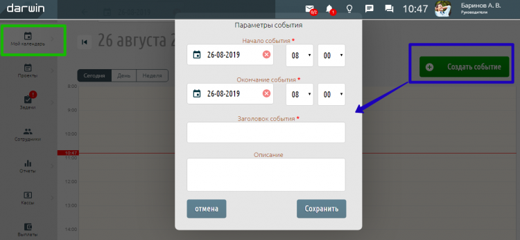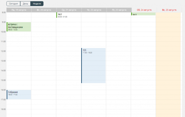 Личный рабочий календарь пользователя. С помощью этого инструмента он может создавать события, указывать участников.