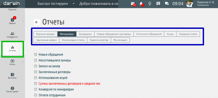 Основной статистический инструментарий Darwin CRM находится в разделе «Отчеты». Он включает в себя одиннадцать подразделов, в которых агрегируются статистические показатели по продажам, деятельности сотрудников, эффективности проводимых акций, качеству работы членов команды (на основе отзывов клиентов), финансовые отчеты и т.д.