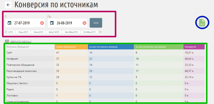 Статистическую информацию можно импортировать в формате XLS.Данные в отчетах представлены в виде таблиц и графиков.