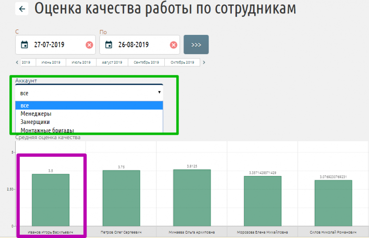 Некоторые метрики снабжены дополнительными фильтрами. Например, метрика «Оценка качества по сотрудникам» включает в себя сортировки статистики по должностям.