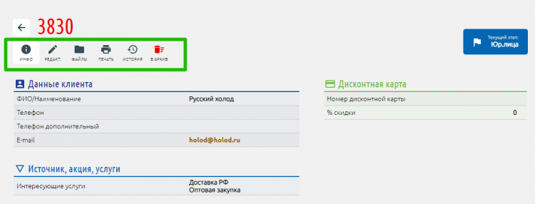 В карточке клиента выводятся его контактные данные, источник лида и история по всем заявкам. Отсюда же можно отредактировать информацию о клиенте, просмотреть прикрепленные файлы и распечатать документ.