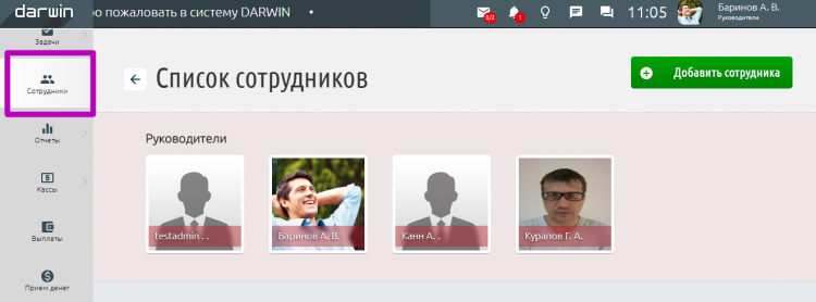 Содержит список членов команды, информацию о них и инструмент для добавления новых сотрудников.