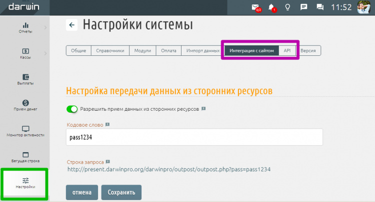 Раздел включает в себя общие настройки Darwin CRM, редактор справочников, список подключенных модулей, состояние подписки, параметры для импорта данных с сайта и интеграции сервисов.