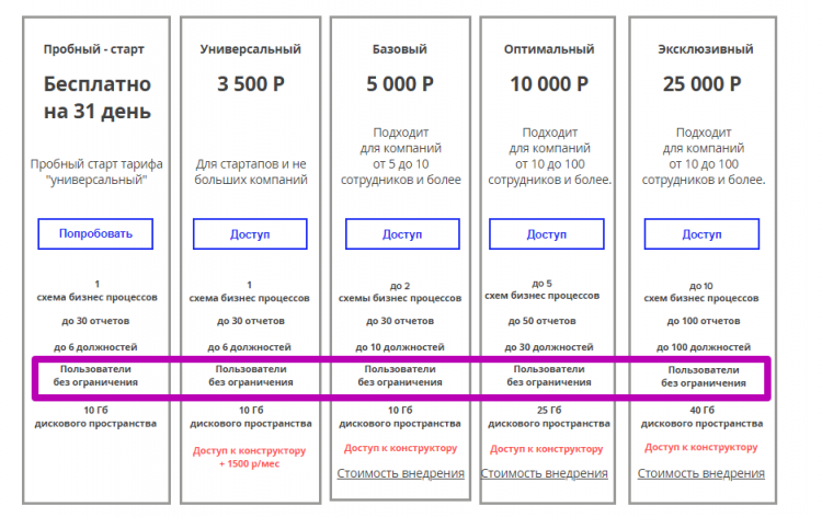 - «Экономная» тарификация – в любом из пяти доступных тарифных планов нет ограничений на количество пользователей.