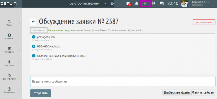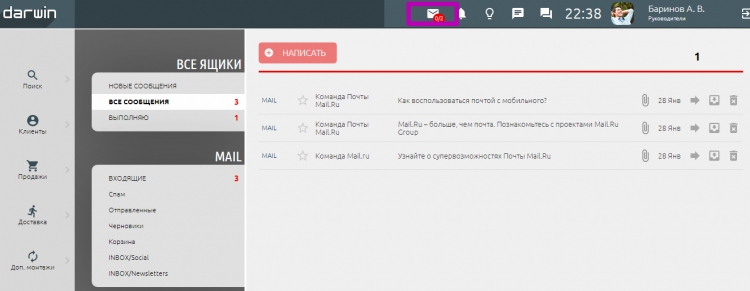 - Сообщения – внутренний мессенджер, встроенный в Darwin CRM.