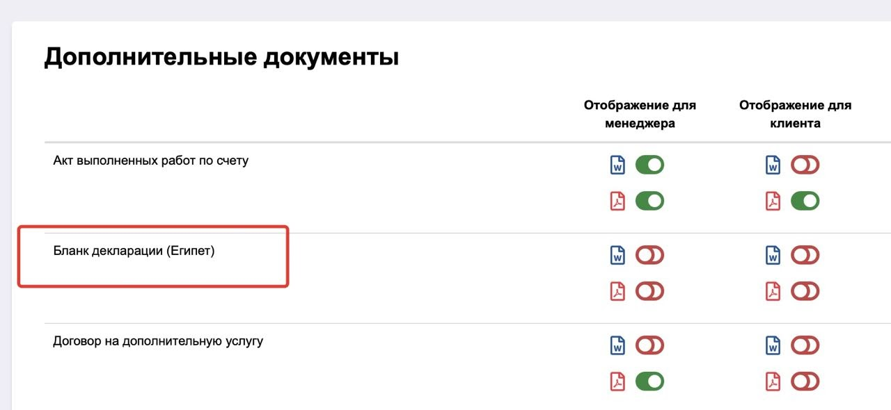 25.10.2021. У нас появился готовый документ "Бланк декларации (Египет)", по умолчанию он выключен, но вы можете его активировать для отображения в заявках.