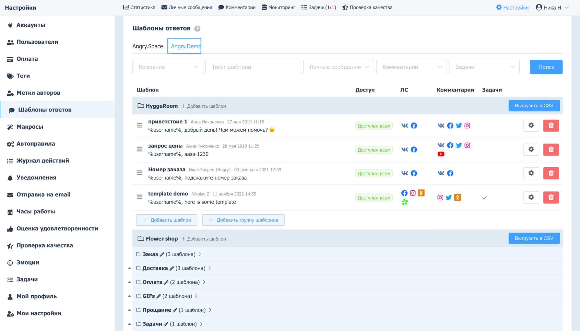 Разработчики Angry.Space учли это и сделали так, что для каждой компании можно настроить отдельные шаблоны и автоправила, а также подобрать уникальные теги.