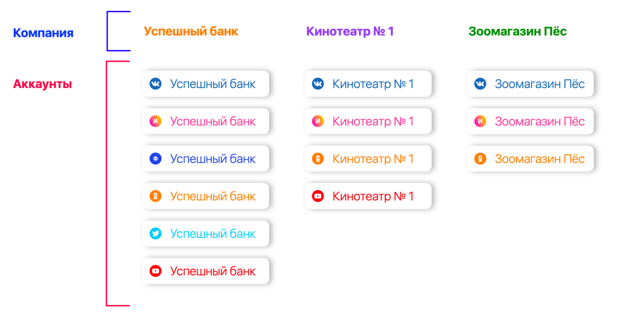 На скрине вы видите 3 разные компании. Самая маленькая из них — зоомагазин «Пес». Она включает в себя 3 аккаунта: сообщество Вконтакте, аккаунт в Инстаграме* и группу в Одноклассниках.