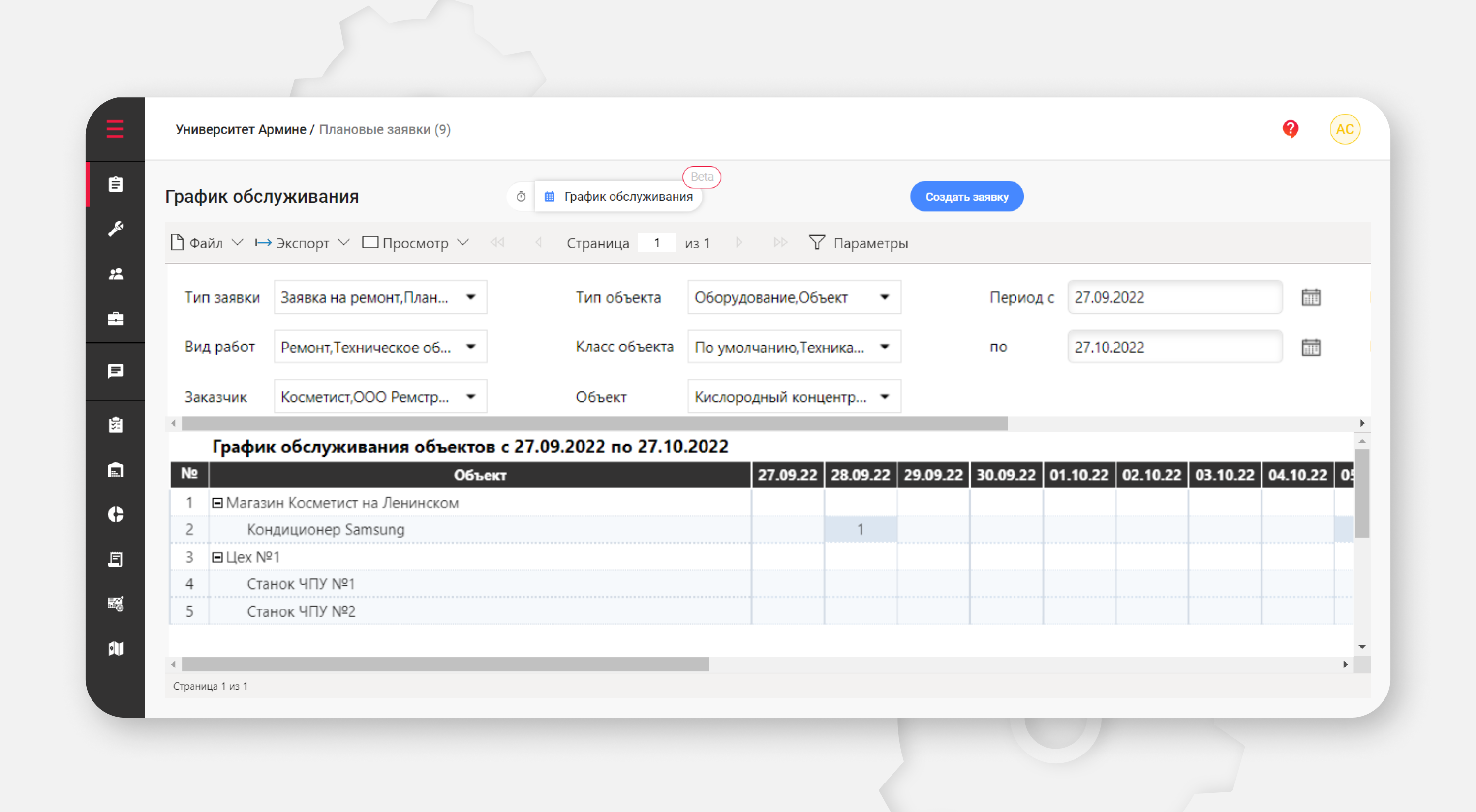 - Удобное отображение плановых заявок по каждому объекту и оборудованию на месяц вперед в рамках одного окна. Сразу видно, какое оборудование, когда и с какой регулярностью обслуживается.