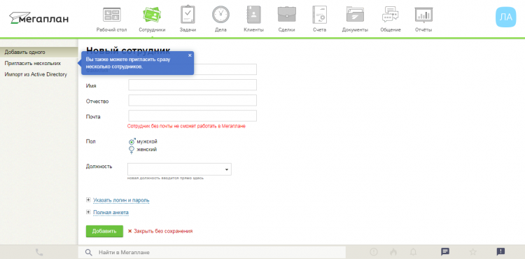 Не знаю, как сделать проект ещё юзабельнее Чтобы добавить сотрудников, в Мегаплане нужно сделать пару кликов и заполнить всего шесть полей. Вдобавок к этому вам постоянно подсказывают, что и как можно сделать.