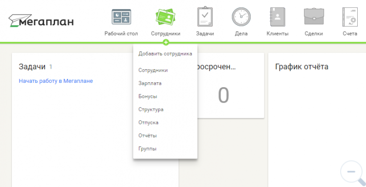 3) Структурированное рабочее пространство. Разработчики Мегаплана здесь постарались: на рабочем столе вы найдёте всю важную информацию, в разделе «сотрудники» увидите всю иерархию, а в «задачах» быстро пройдётесь по всем срочным делам.