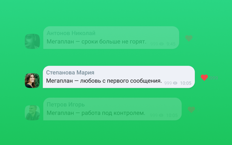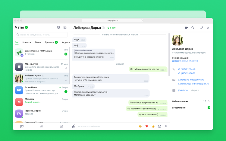 Бизнес-чат должен отличаться от обычного чата, который мы используем для общения с друзьями, большей информативностью. Поэтому как альтернатива в Мегаплане для него был выбран полноэкранный режим с тремя окнами: слева все обсуждения, в которых вы участвуете, в центральном окне основная переписка, в правом карточка собеседника с фото, названием должности и контактами. Таким образом, вся информация, которая вам только может понадобиться, будет всегда перед глазами.