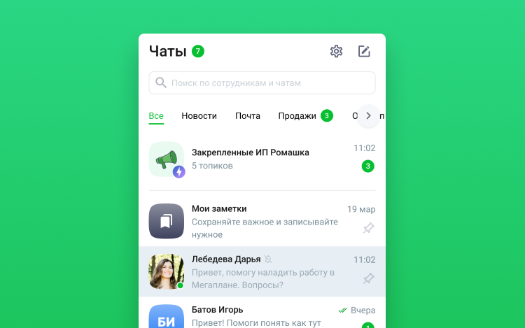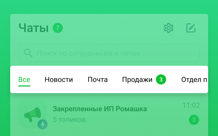 Если руководитель хочет донести важную информацию до сотрудников, он может закрепить чаты в самом верху списка для более быстрого доступа.