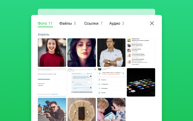 Во время переписки мы часто обмениваемся ссылками, файлами, аудиосообщениями. В Мегаплане они автоматически распределяются по вкладкам, чтобы их было проще и удобнее находить.