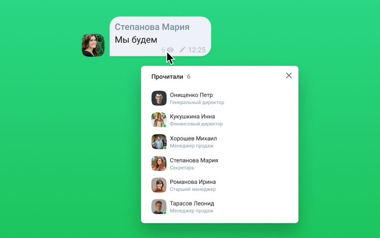 Около каждого сообщения находится «глазок», который показывает, сколько человек и кто именно прочитал сообщение. Эта функция особенно актуальна в групповых обсуждениях. Больше никто не сможет сказать, что пропустил или не прочитал какое-то сообщение!
