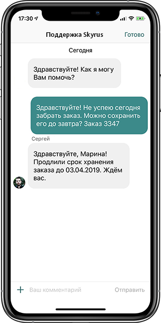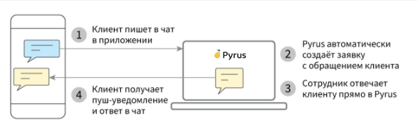 Pyrus позволяет встроить удобный чат в ваше мобильное приложение и в режиме реального времени общаться с вашими пользователями. Когда клиент пишет в чат, ваша служба поддержки автоматически получает тикет в Pyrus. Специалист отвечает на заявку прямо в Pyrus, а клиенту приходит пуш-уведомление на телефон и ответ в чат вашего мобильного приложения. Это позволяет специалистам поддержки оперативно решать вопросы клиентов.
