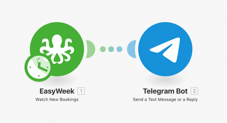 Integromat - один из самых удобных сервисов автоматизации, одна из фишек - возможность интеграции с Telegram. Вы можете соединить EasyWeek с Telegram и получать уведомления о записи напрямую в месенджер. Это очень удобно!