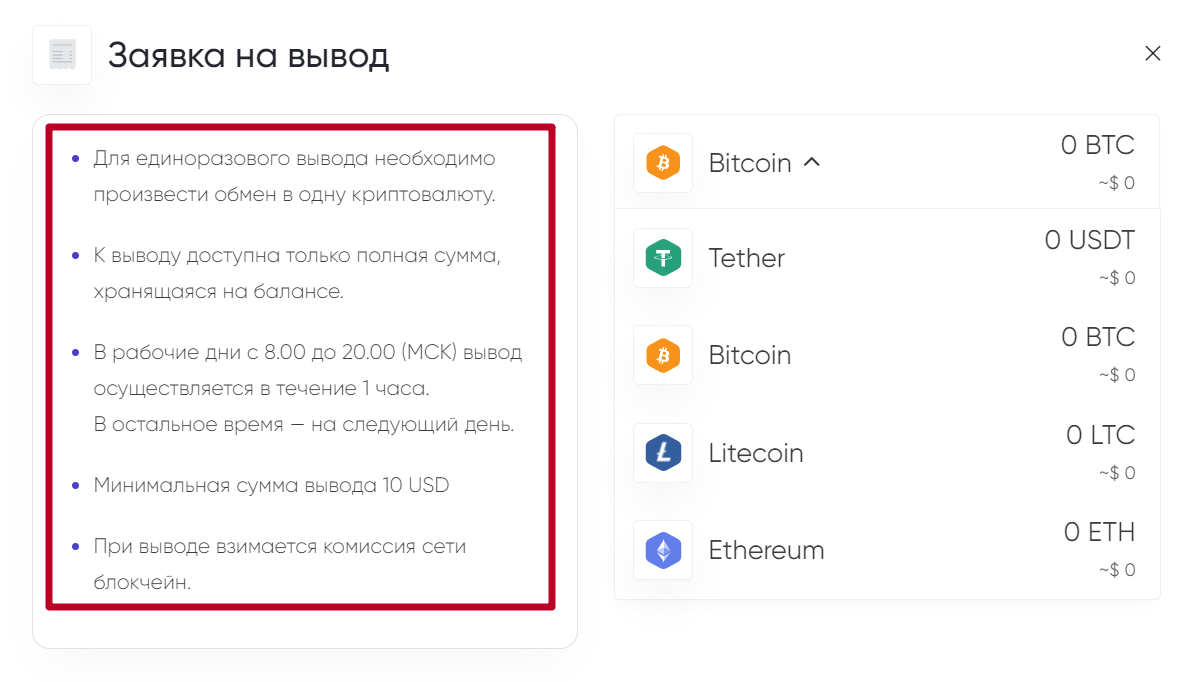 - Поддерживает широкий перечень криптовалют – BTC, USDT, LTC, ETH, USDC, BUSD.