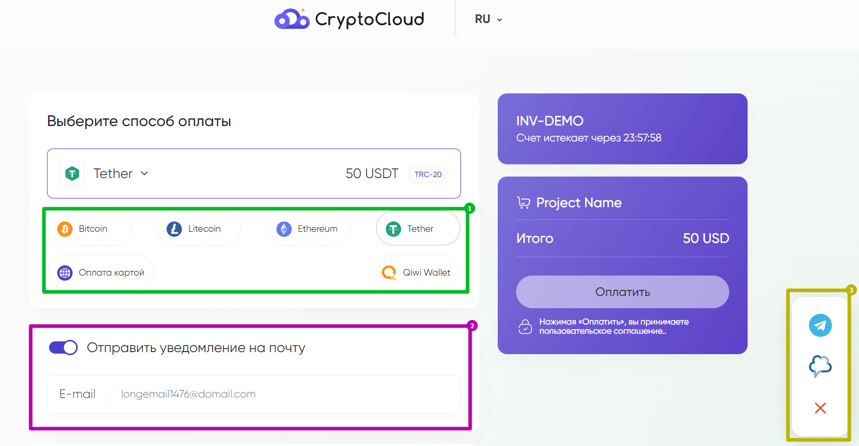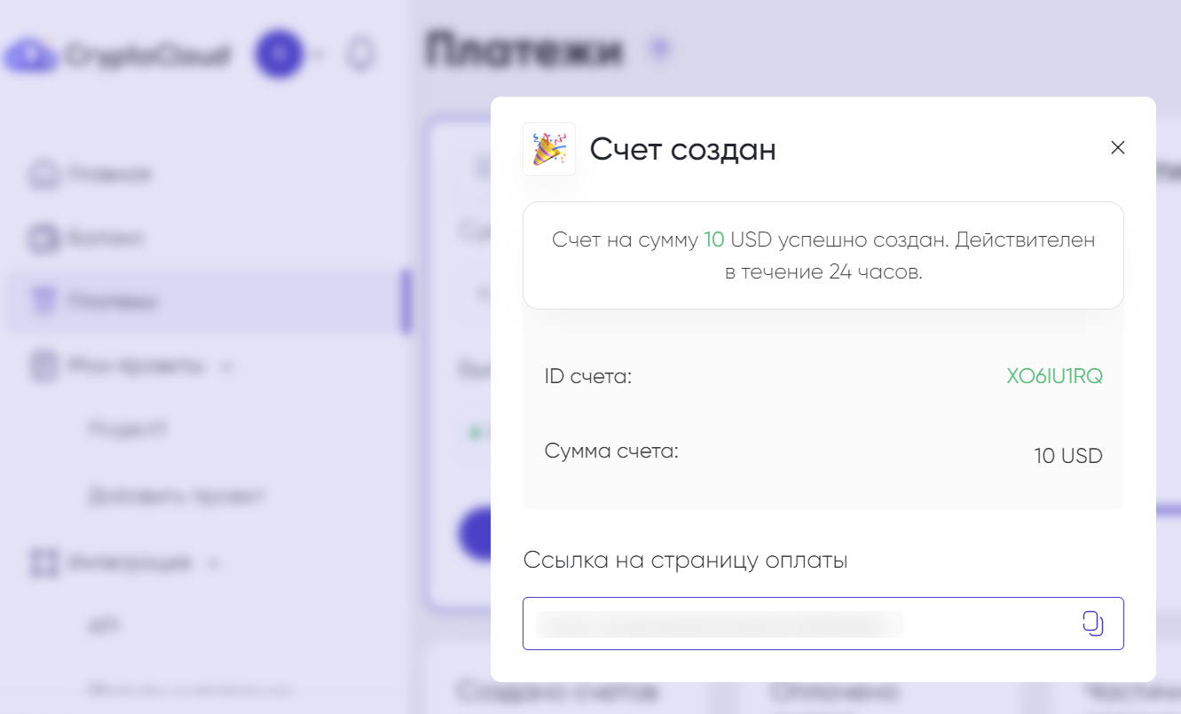Интеграция крипто валютной платежной системы – не единственный инструмент, который предлагает CryptoCloud. После создания проекта вы можете сразу принимать оплату, перенаправляя клиентов на специальную страничку. Для этого достаточно создать счет.