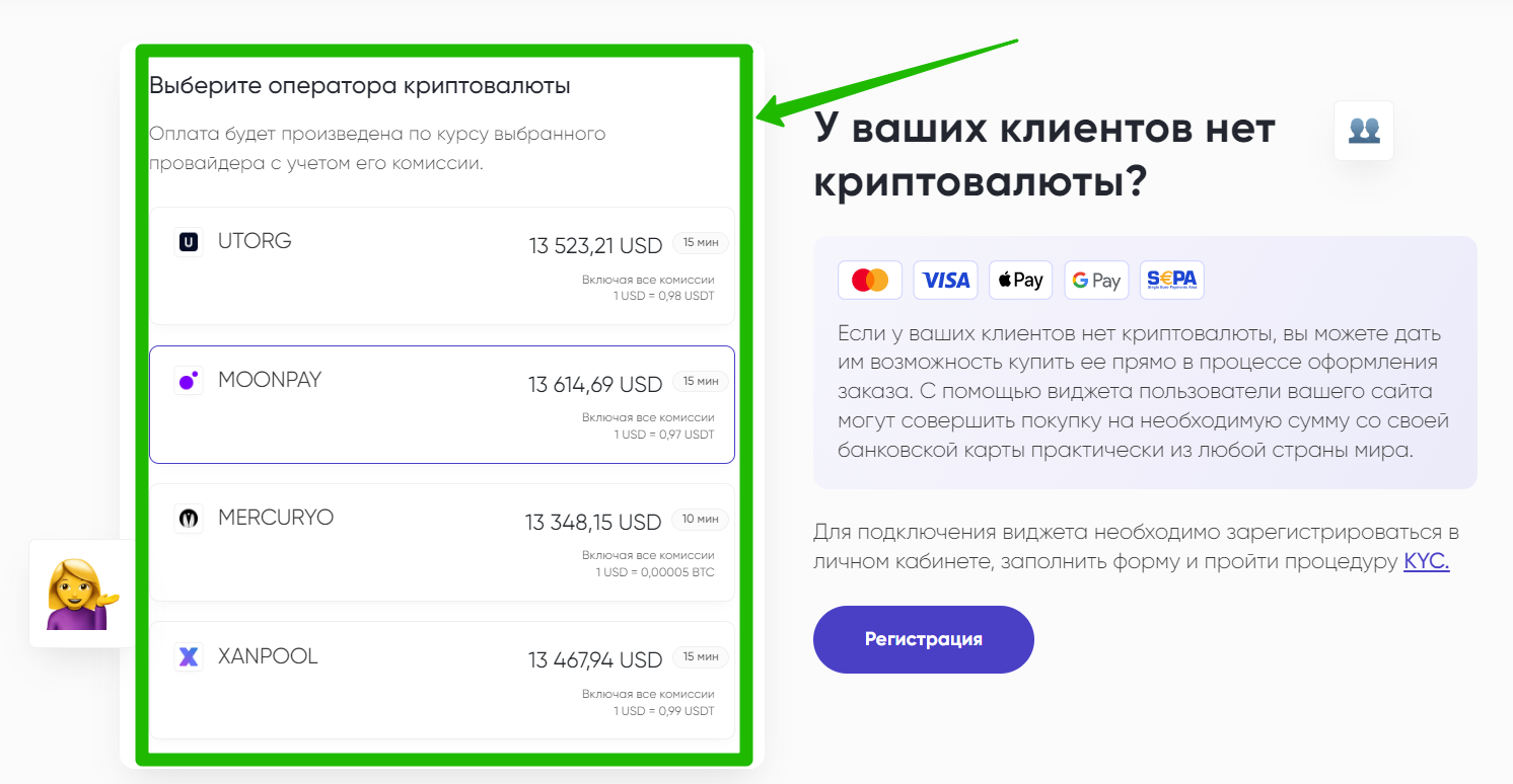 - Предоставляет универсальные решения для приема фиатных и криптовалютных платежей – с их помощью ваши клиенты смогут расплачиваться криптовалютой, а при отсутствии таковой приобрести ее за фиаты при оформления заказа на сайте.