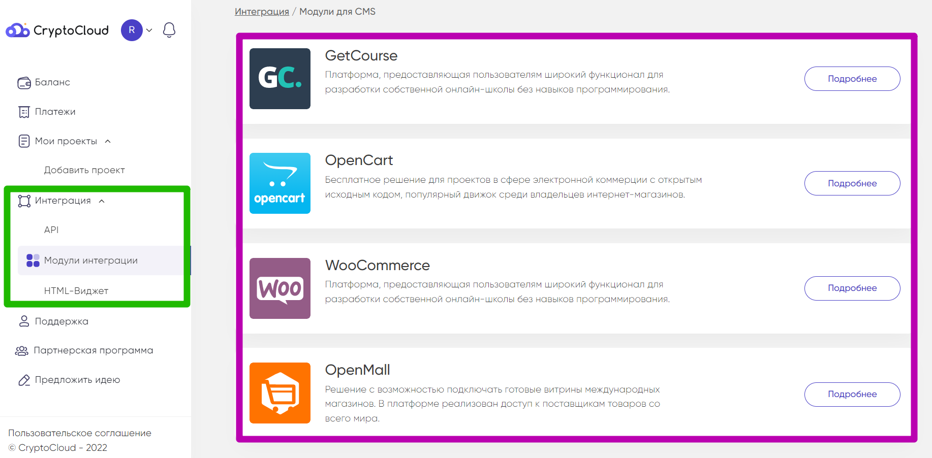 Интеграция специализированных модулей не вызовет у вас проблем. Каждый из них снабжается подробной инструкцией. А при возникновении трудностей всегда можно обратиться в поддержку сервиса. Остальные интернет-площадки можно интегрировать с CryptoCloud с помощью нативного API.