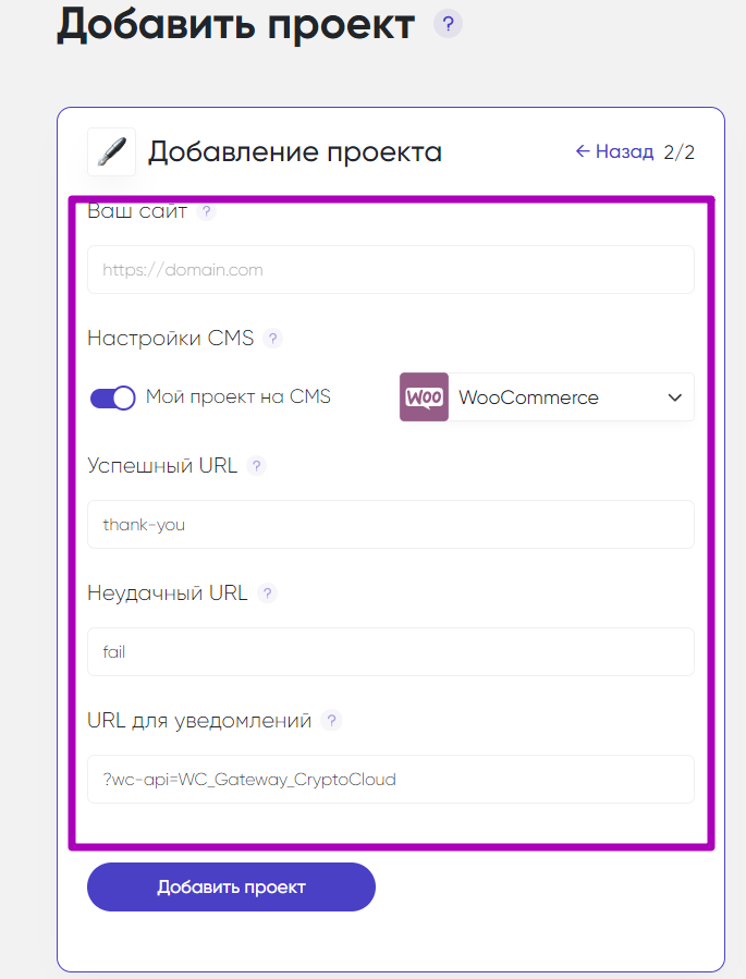 На втором шаге создания проекта указывается целевой сайт, URL веб-страниц успешной и не прошедшей оплаты. А также адрес, куда будут направляться системные сообщения о платежах.