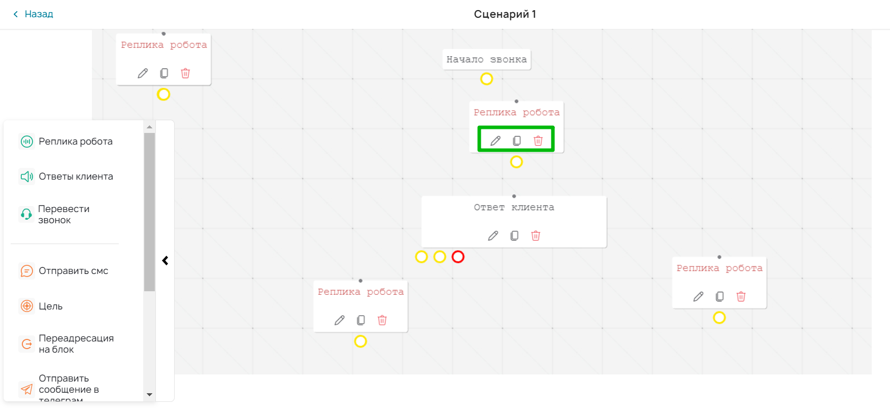 И не стоит пугаться упоминания скриптов. В CRMCalls вам не потребуется даже базовых знаний программирования. Составление сценария разговора и прописывание реакций робота на возможные варианты ответов собеседника происходит предельно просто в конструкторе путем перетаскивания блоков курсором мыши.