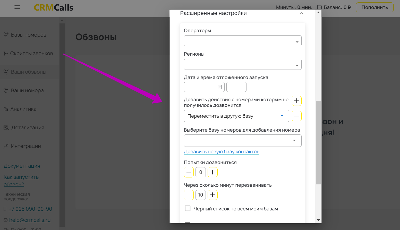 Кроме этого здесь присутствуют параметры для дополнительного таргетинга аудитории (по мобильным операторам, гео), установки количества дозвонов и действий с абонентами, с которыми не получилось связаться.