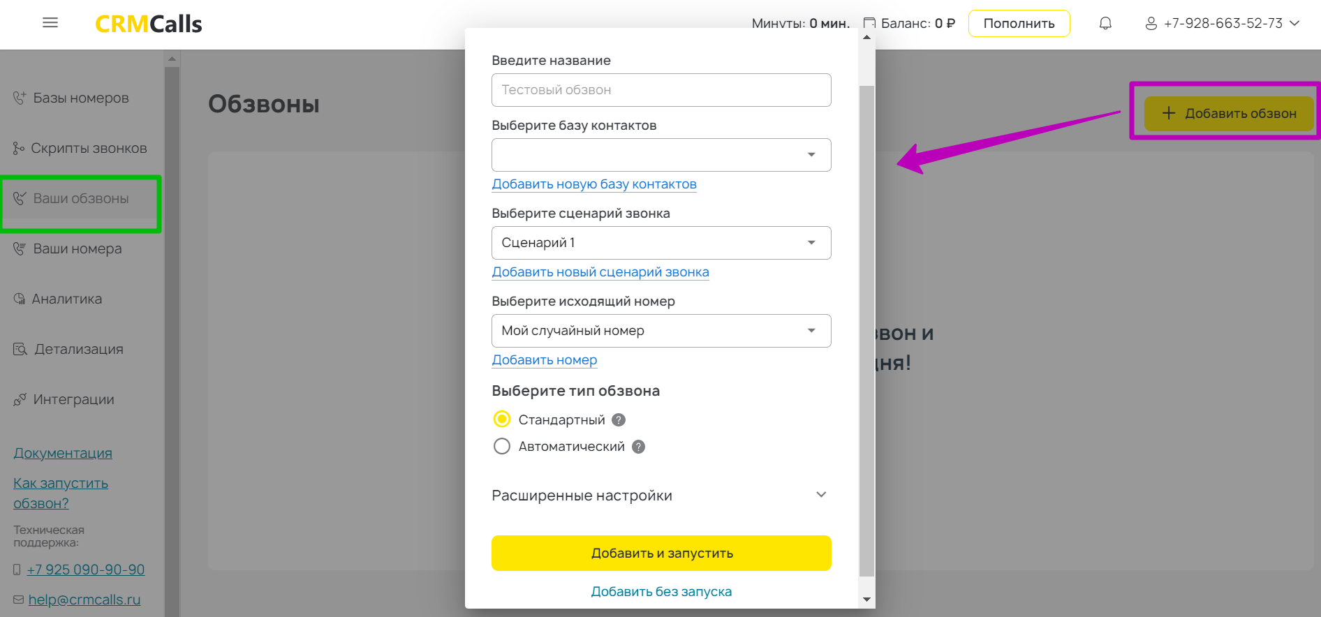 - Создаем новый обзвон, в параметрах выбираем базу данных, сценарий, номер и запускаем его.