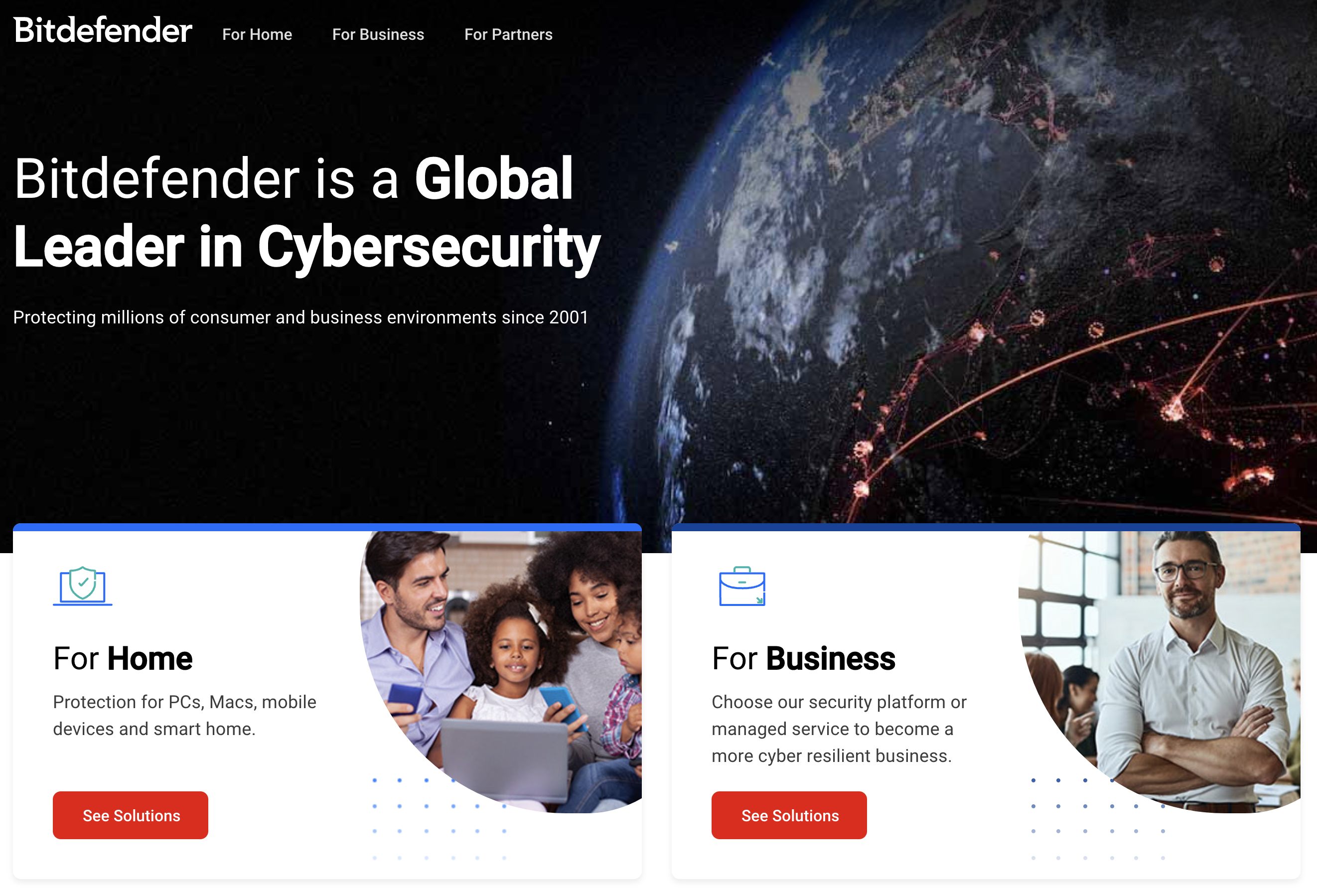 - Bitdefender — защищает в том числе от онлайн-мошенников, шифровальщиков, фишинга;
