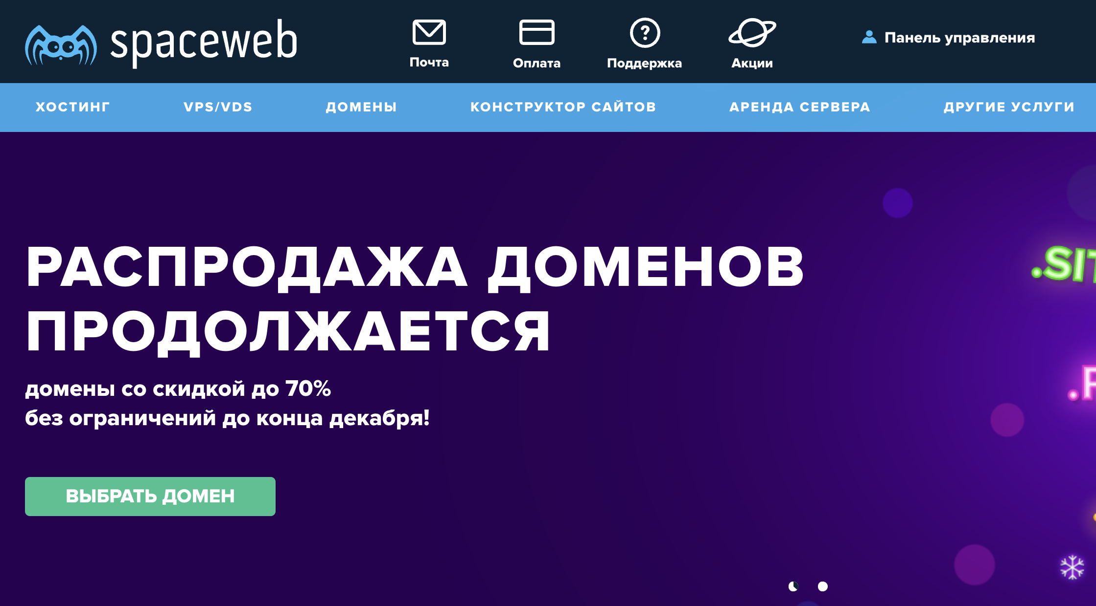 Spaceweb — один из лучших российских провайдеров хостинга по количеству поддерживаемых доменов. Кроме размещения web-ресурсов на виртуальном хостинге, выделенном сервере и VPS предлагает конструктор сайтов с бесплатным базовым функционалом. Подходит для интернет-магазина, личного или корпоративного ресурса, блога, форума и т.д. В зависимости от назначения и посещаемости площадки можно выбрать наиболее подходящий тарифный план. Все тарифы включают удобную панель управления, домены и субдомены, антиспам и антивирус для электронной почты. Резервное копирование выполняется автоматически один раз в сутки.