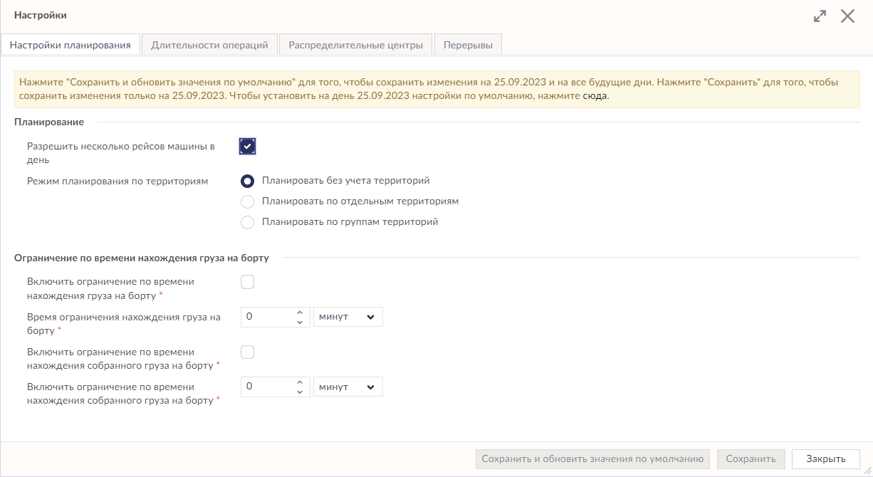 Также в настройках планирования логистики можно закрепить за каждым авто отдельные территории доставки, разрешить осуществлять несколько рейсов. А также задать ограничения по времени нахождения груза на борту.