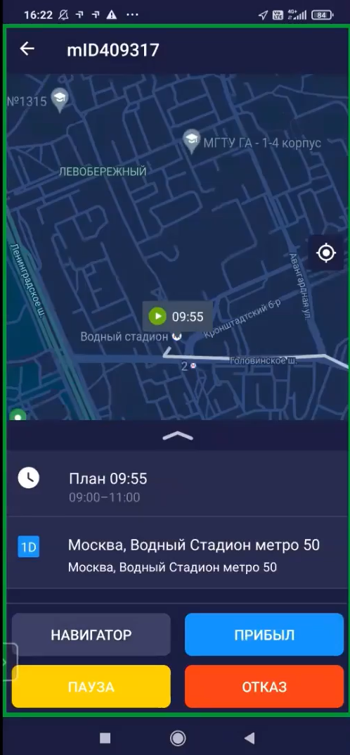 - Мобильное приложение для исполнителей (водителей и курьеров) – тесно взаимосвязано с логистическим сервисом. Все действия водителей в приложении и движение автомобилей (курьеров, исполнителей) отображается на карте. Обновление ее состояния происходит в режиме реального времени благодаря постоянному отслеживанию положения транспорта через смартфон курьера или специализированный GPS-трекер. После отправки из сервиса, маршрут становится доступен водителю в приложении. Дополнительная оптимизация маршрута достигается благодаря интеграции с навигаторами.