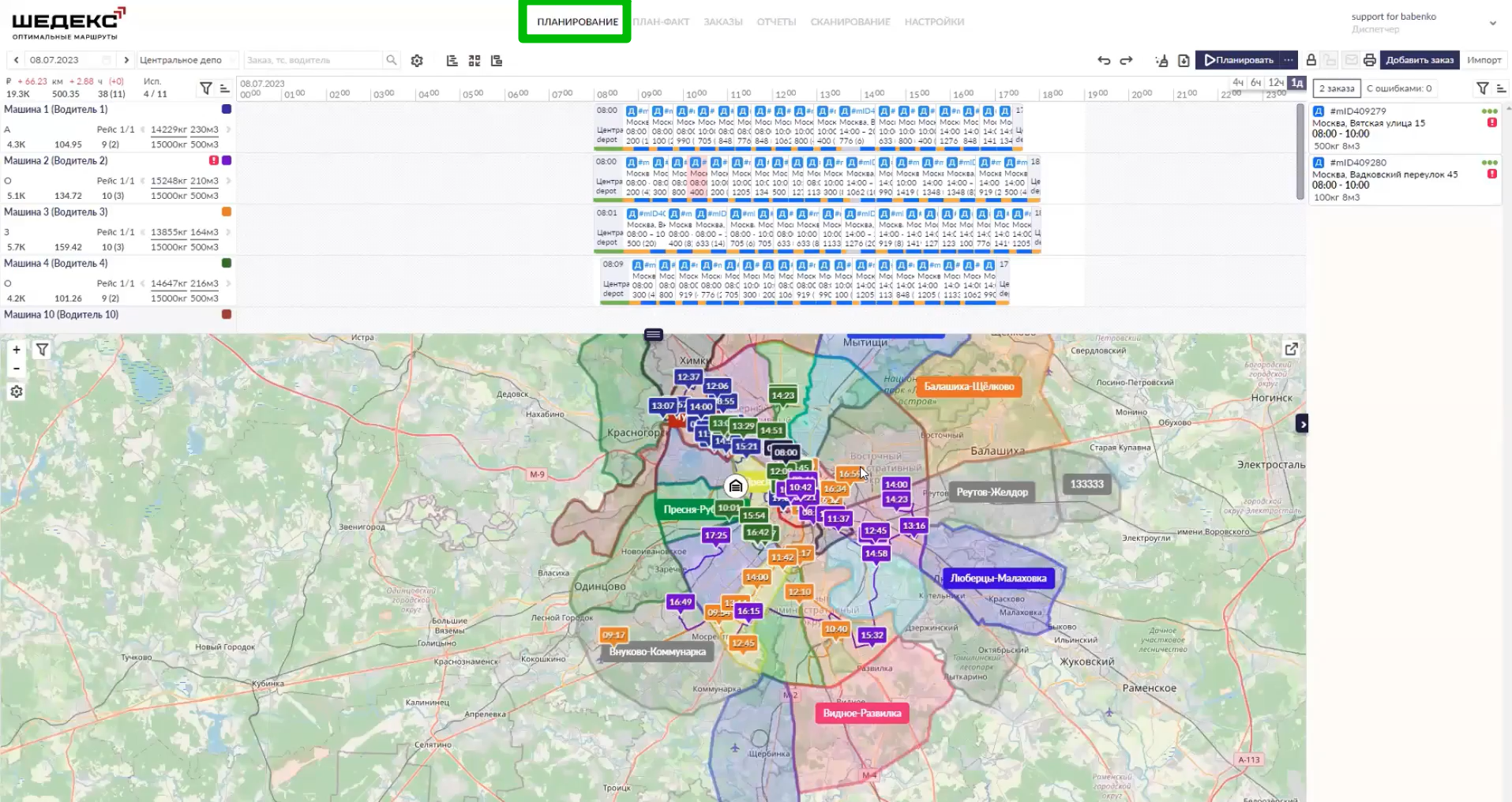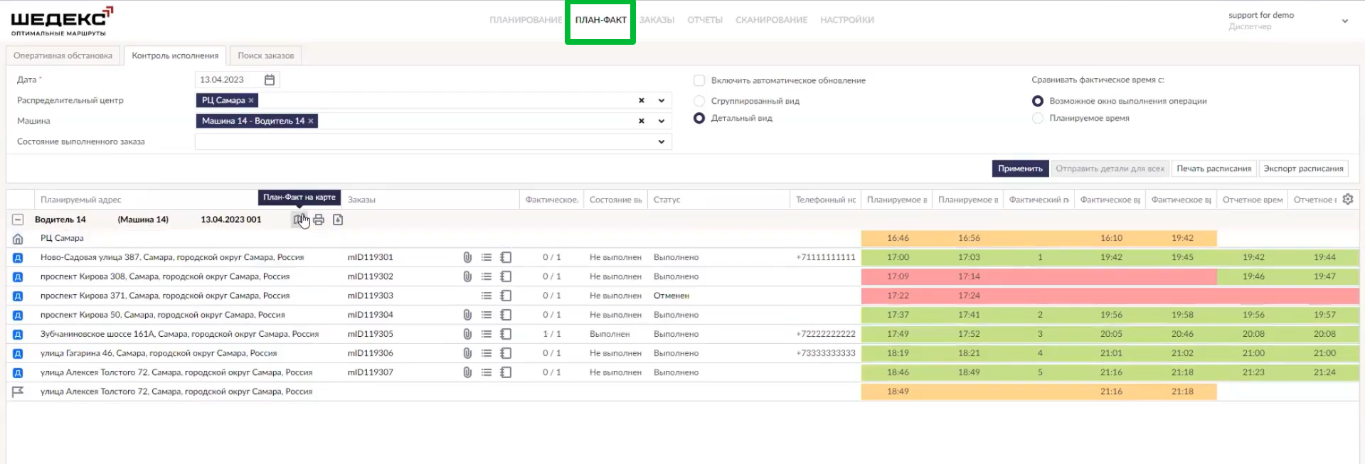 При этом сервис снабжает диспетчера исчерпывающей информацией по состоянию доставки в целом и по каждому водителю отдельно. Эти сводки находятся в разделе «План-факт».